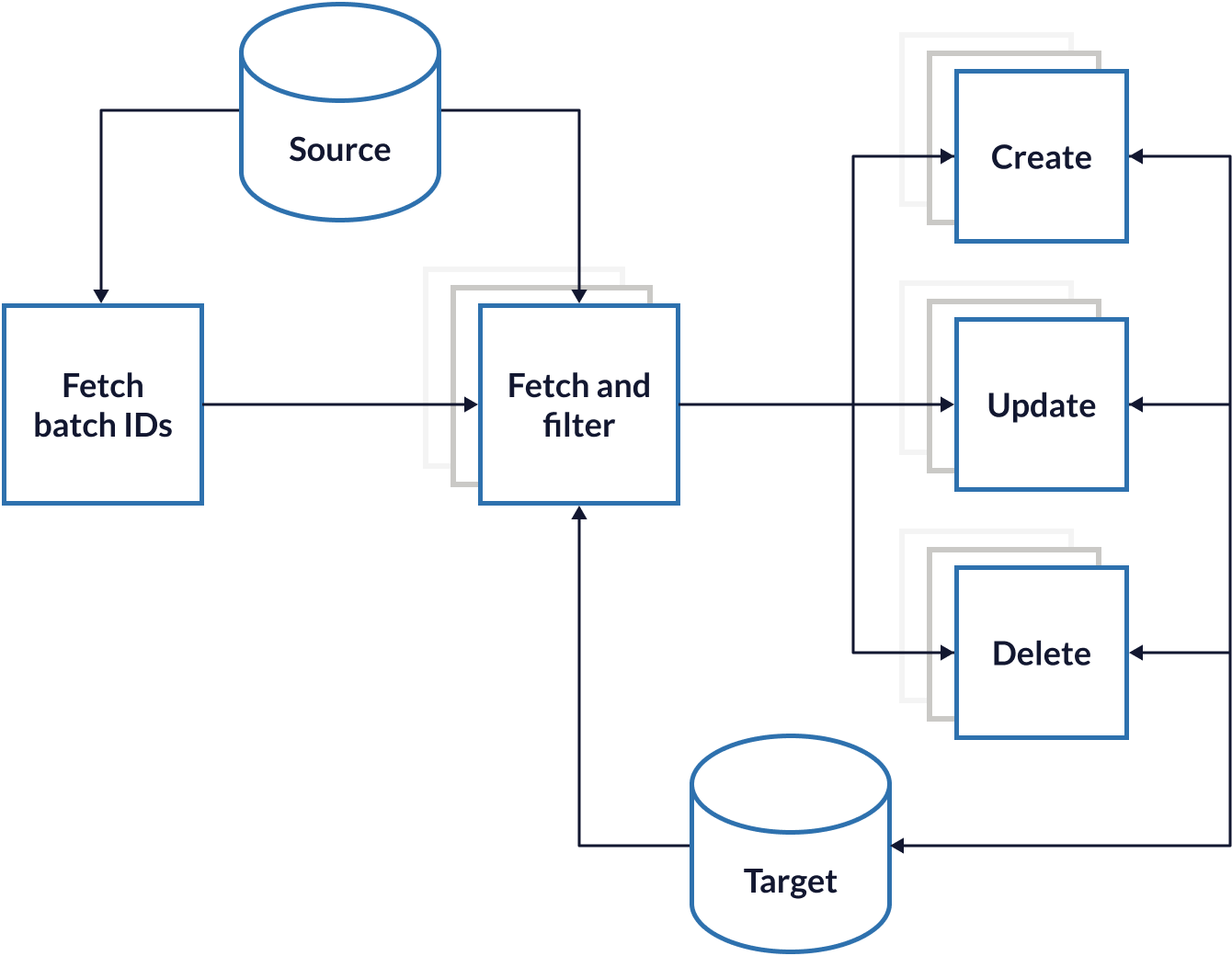 After retrieving the batch IDs, “fetch and filter” queue jobs retrieve the data from the source database, then filter it for further processing using the same heuristics developed in version two. Separate jobs are dispatched to modify the target database to match the source.