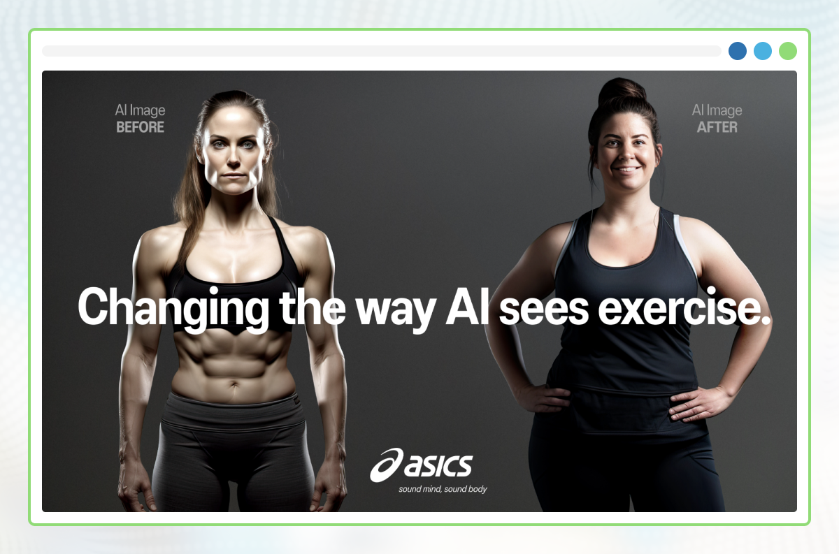 For example, ASICS generated an AI campaign entitled “Changing the way AI sees exercise”. Their campaign says when you AI to portray someone that’s healthy and exercises, “You get images of people with minimal body fat, chiselled jaws, and muscles.AI has been taught that exercise is purely for physical transformations. This is feeding into unrealistic body standards and damaging our mental wellbeing…and it has learnt this from us.”. They then launched an AI Training Programme to teach AI tools that the power of exercise is much more than physical gain, the public can even submit their own images into the experiment.