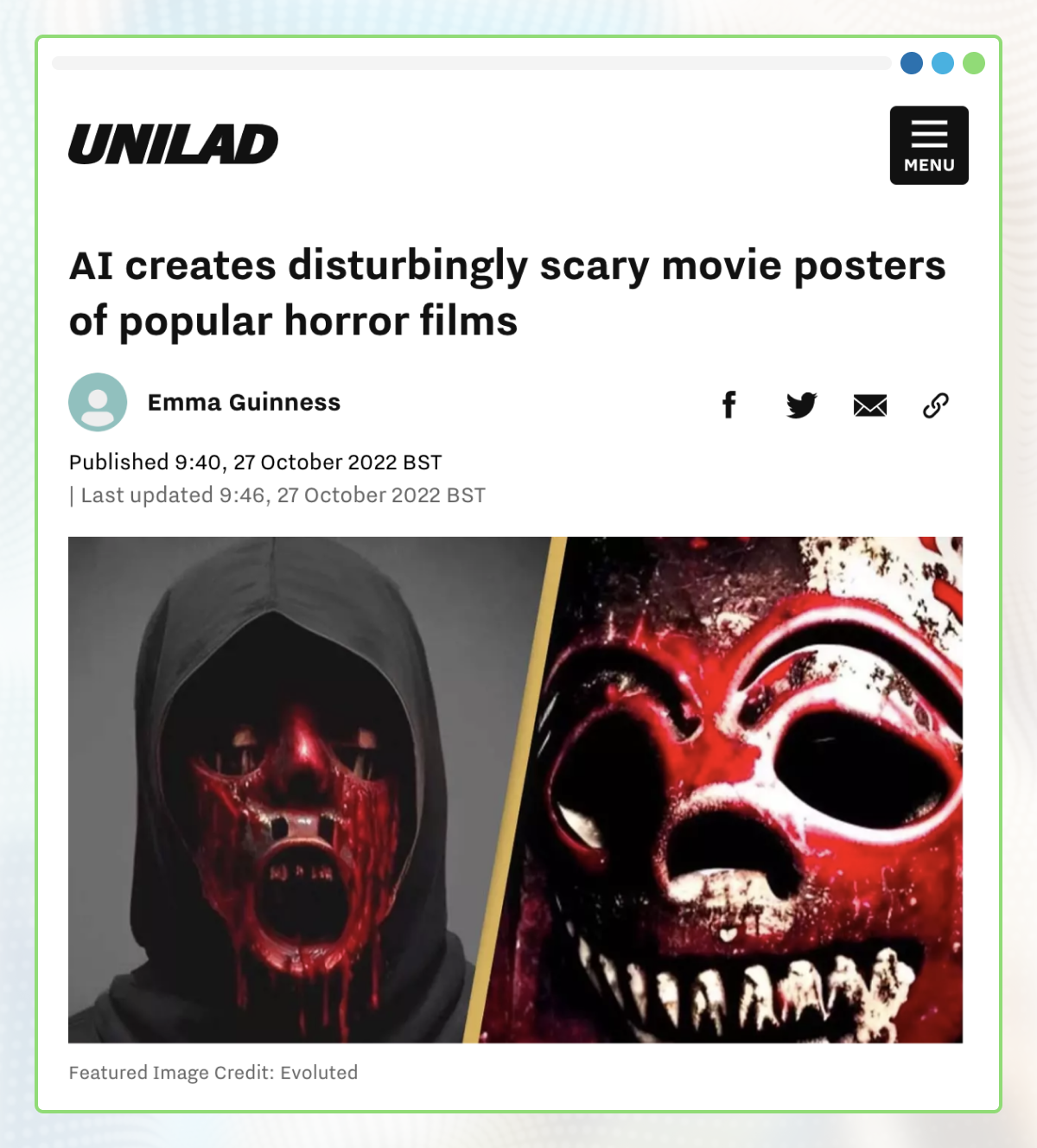 AI images can be the focus of your creative PR campaign, for example, the PR team at Evoluted utilised Wonder AI for a halloween campaign, ‘Evoluted x AI: Halloween Horror Posters Reimagined’. We took our We took our favourite horror posters and reinvented them with AI. To create the new concepts, we submitted relevant keywords from the film into an AI tool and took inspiration from the original posters to generate the new eerie images.
