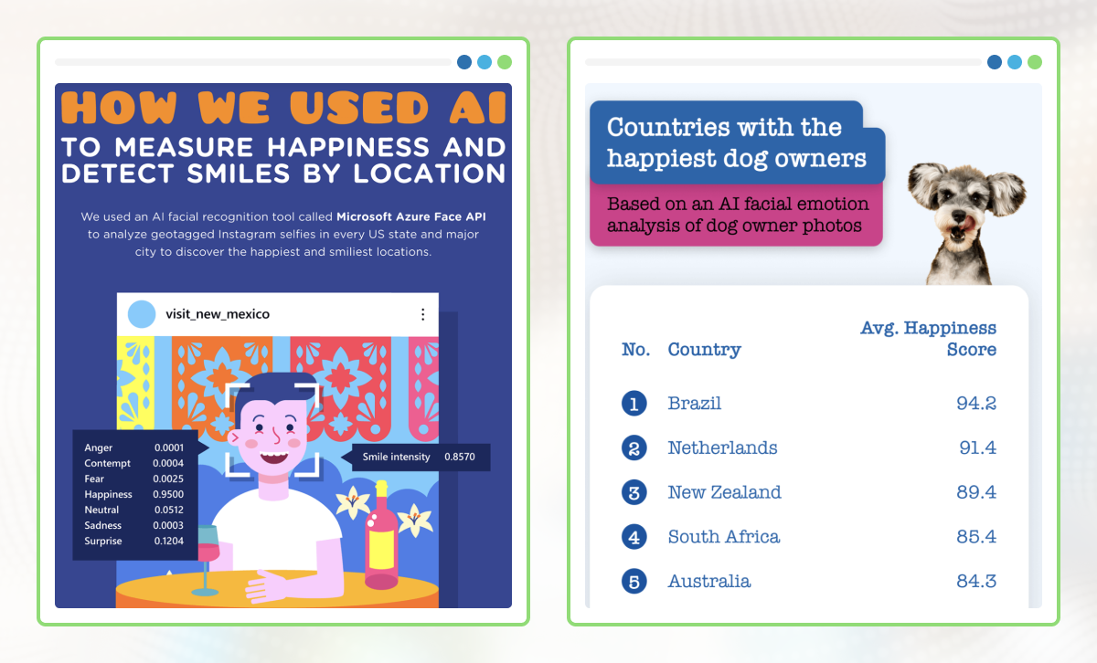For example, you could use it to identify emotions in images and create a campaign surrounding this. A House Fresh PR campaign by Neomam used Azure, and “analysed a database of Instagram selfies from every state and the 100 biggest U.S. cities to see which are the happiest places to live. This facial recognition tool places numerical estimates on emotions based on characteristics and expressions. To work out the happiest cities and states, we used the FaceAPI happiness score, averaging all the scores in each location.”.