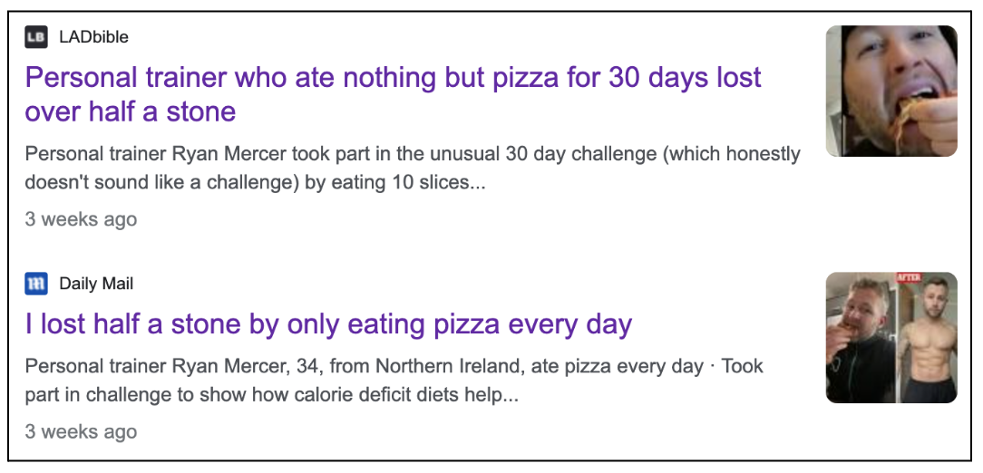 The story gained coverage across dozens of platforms because of the ‘remarkable’ angle, it includes informative quotes detailing how others can lose weight without restricting their favourite foods.
