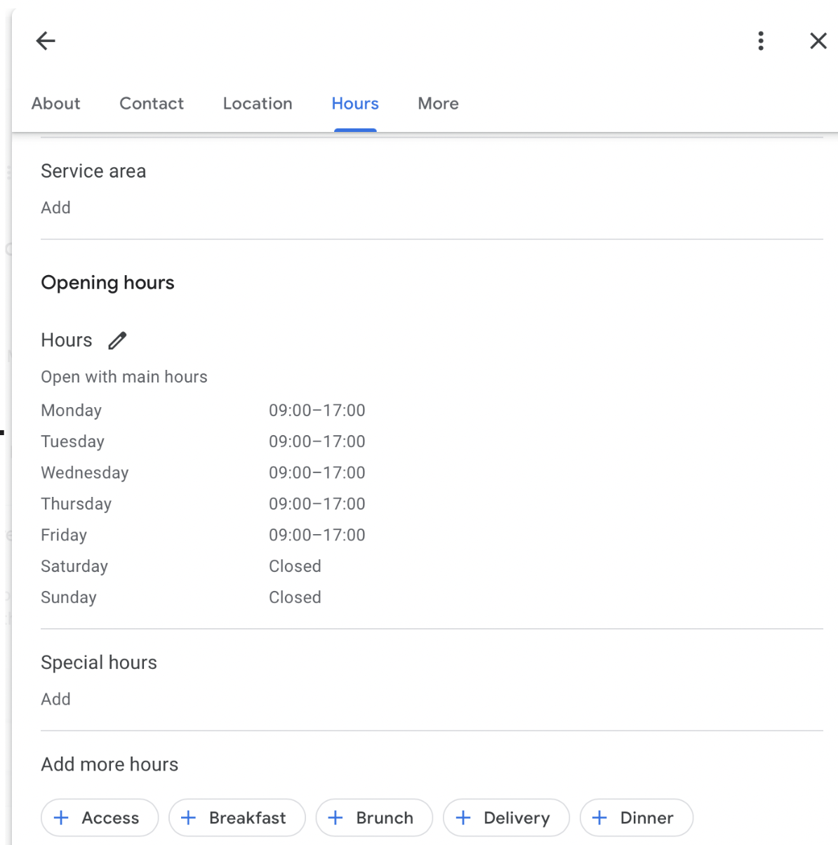 A pop-up box will open with various information that you can edit as an owner of the business. Move to the "Hours" tab: