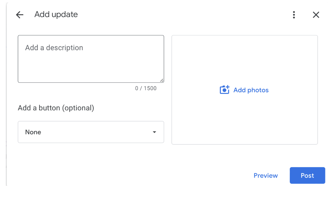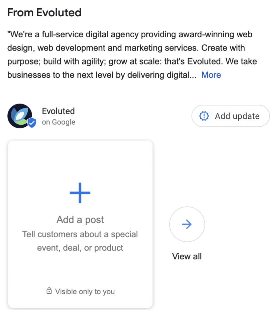 Open your business profile on Google and then simply scroll down. You will see in the regular updates section an ‘add update’ button as well as a large ‘add a post’ button.