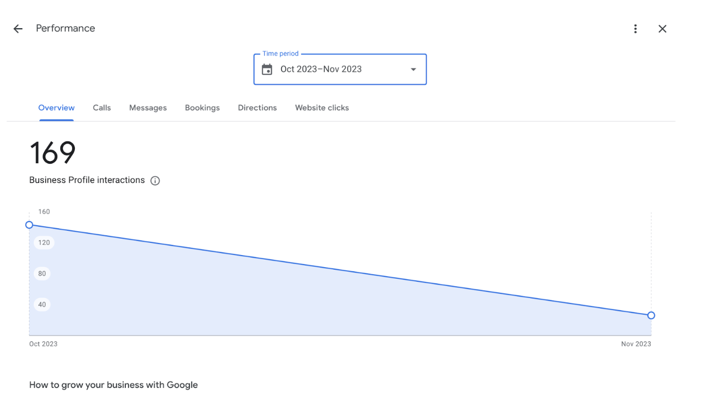 Google Business Profile Insights breaks down data related to your local search performance, including: