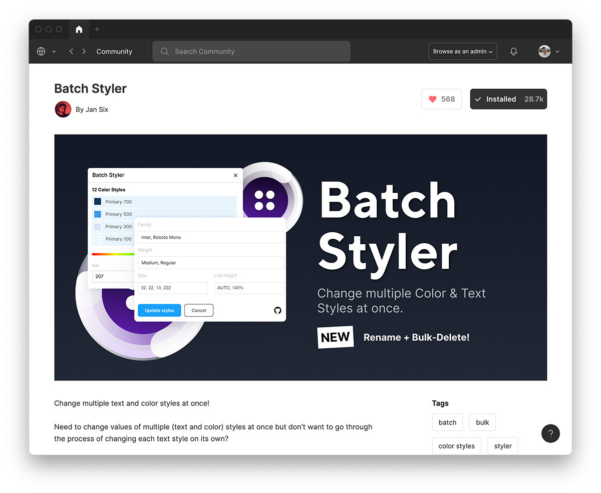 With Batch Styler you can quickly edit multiple text and colour styles at once. This is great if you need to make quick changes to a design system or new project file. You can quickly edit headings, body text & colour styles to match any updated branding changes.