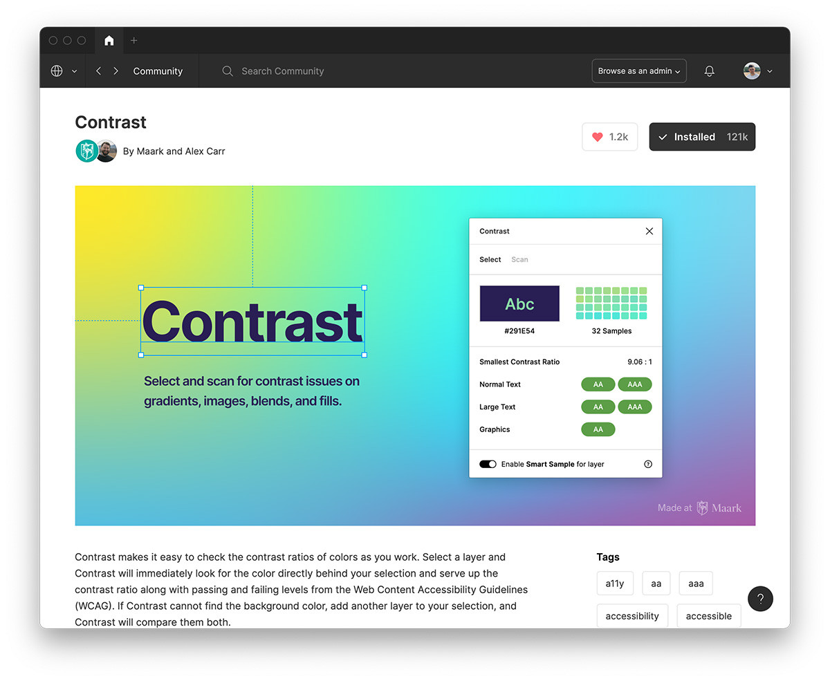 The Contrast plugin is a great tool to quickly check your colour contrast ratio and assure your project is as accessible as possible. You can select and check specific elements in your file, or scan the entire canvas. You can quickly pick up on any contrast issues & fix them accordingly.