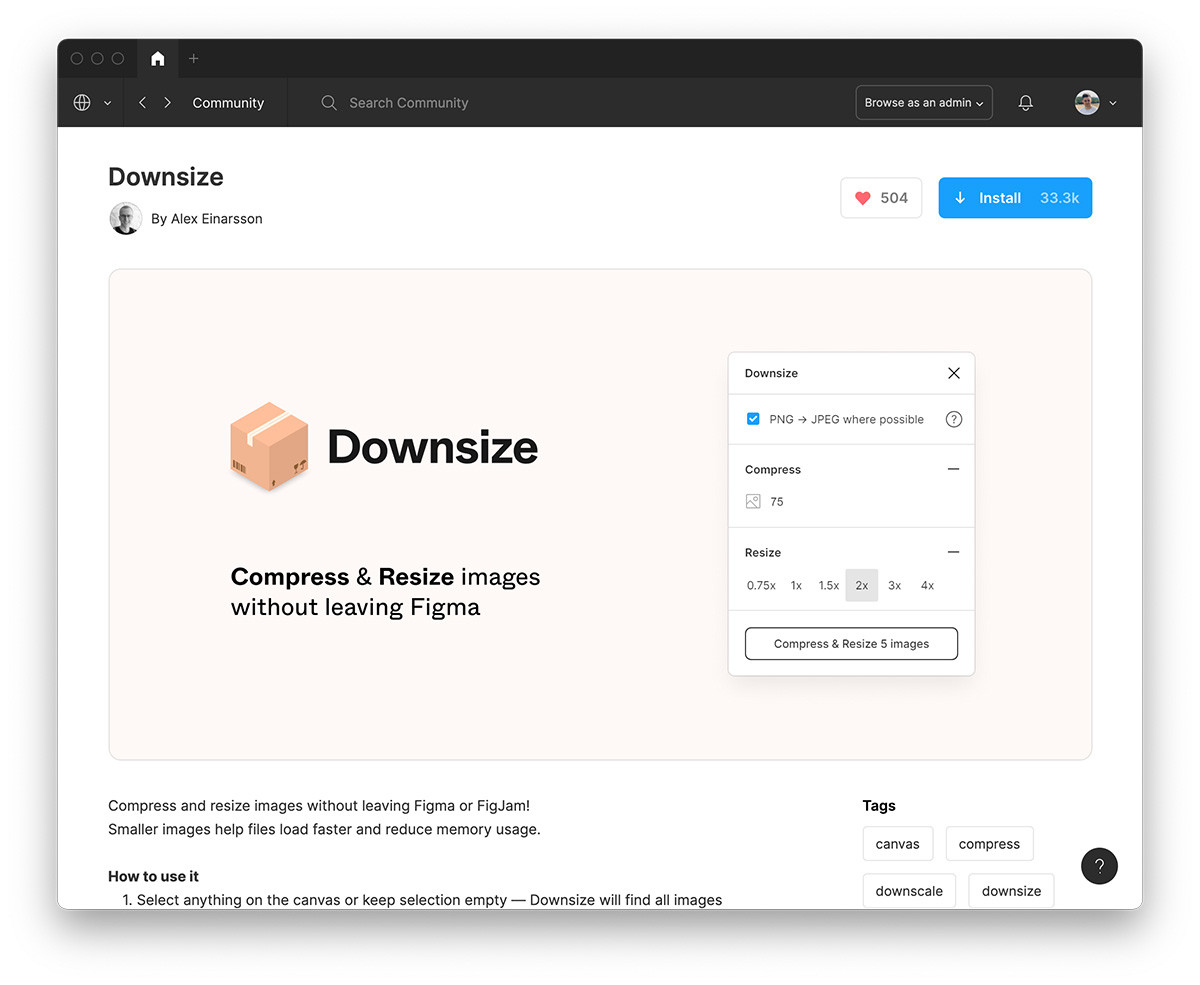 When working on large design projects, Figma files can sometimes take a long time to load up any images. Downsize allows you to compress and resize images without leaving Figma. The smaller images help files load faster and reduce memory usage.