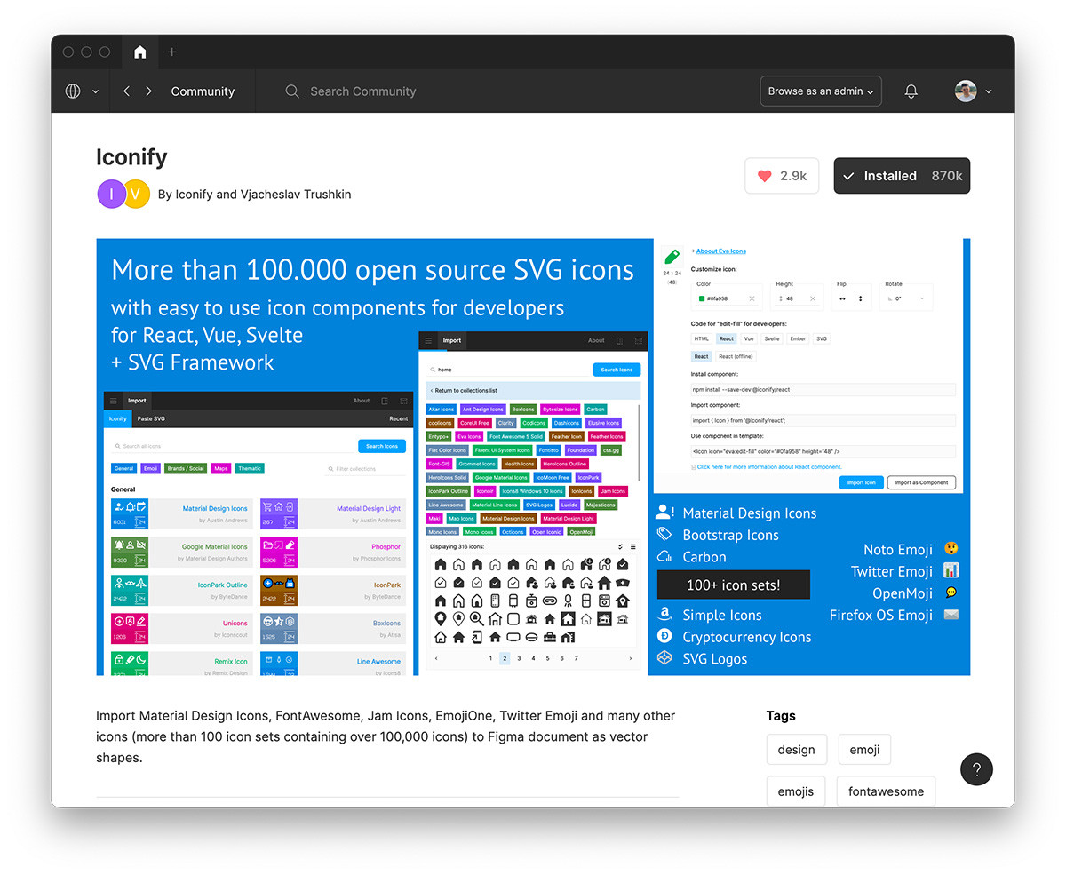 Iconify allows you to quickly search and import vector icons into your file. Iconify has over 100 icon sets, which contain over 100,000 icons. Open source icon families include Material Design Icons, FontAwesome and Jam Icons to name a few.
